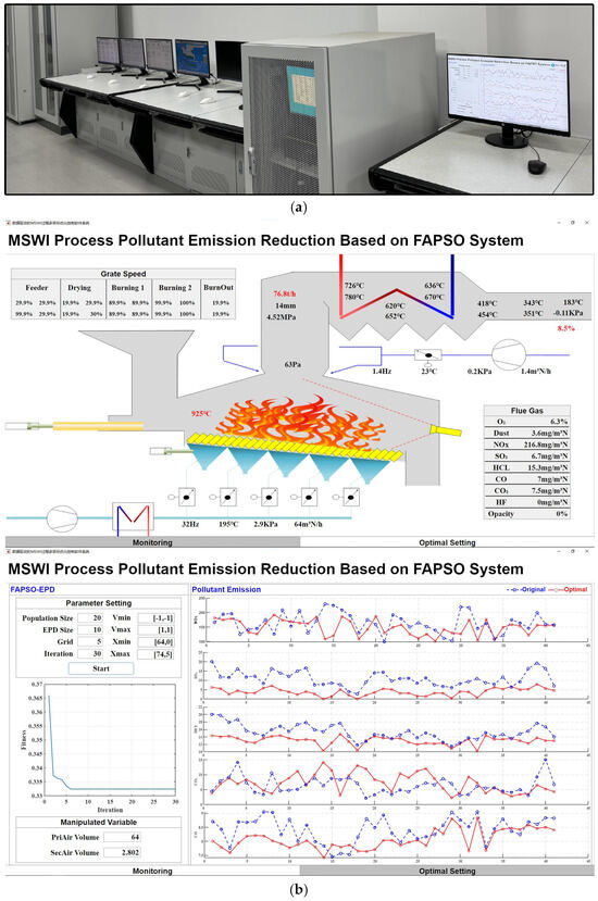 As shown in Figure 7, a process monitoring subsystem software was developed based on the proposed BO-IT2FNN controller and successfully deployed in the AISE3CMP-MSWI. In Figure 7a, it is particularly noteworthy that the BO-IT2FNN controller is implemented on the monitoring computer, which transfers the manipulated variable to the PLC device via the OPC protocol for bidirectional communication. The controlled variable values, generated by the controlled object model, are fed back to the BO-IT2FNN controller through the PLC, thereby completing the closed-loop control process.