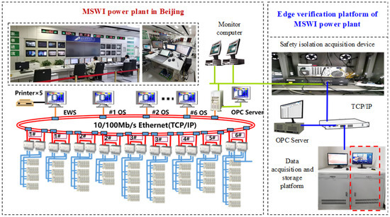 To facilitate in-depth research on AI algorithms for the MSWI process, we transplanted the forward data acquisition and isolation subsystem to the MSWI plant, aiming to achieve real-time acquisition and storage of industrial process data. After years of operation, the results demonstrate that the subsystem operates reliably in real-world conditions, ensuring uninterrupted operation of the Intranet system. The bidirectional protection mechanism of the subsystem guarantees secure and stable communication between the industrial site and the data processing platform, further enhancing the practical application potential of AI technology in the MSWI process. The network topology and structure of the data acquisition system are illustrated in Figure 9.