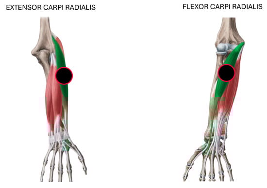 Electrode placement for EMG acquisition. Surface electrodes were positioned following a bipolar configuration over two muscle groups: the flexor carpi radialis and extensor carpi radialis.