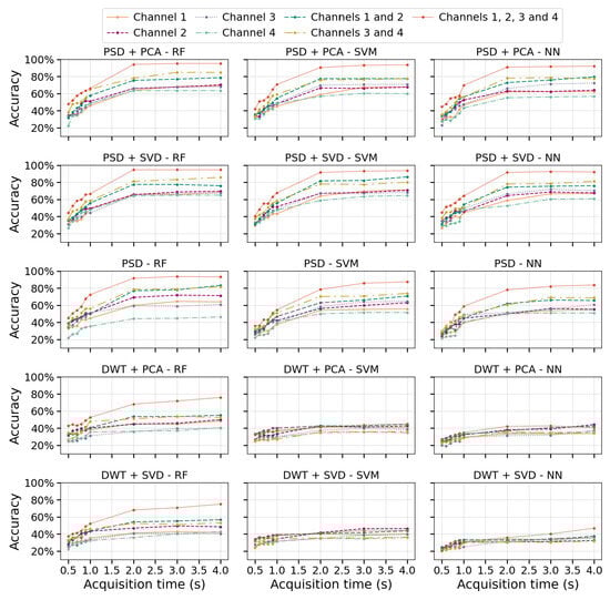 To thoroughly evaluate classification performance, we examines all 63 combinations of temporal windows and channel configurations using a dataset of healthy individuals. Each configuration is tested with five feature extraction methods—PSD, PSD+PCA, PSD+SVD, DWT+PCA, and DWT+SVD—along with three classification algorithms: RF, SVM, and NN. This results in a total of 315 classification experiments. Accuracy is the primary metric for quantifying the overall prediction correctness across the configurations.