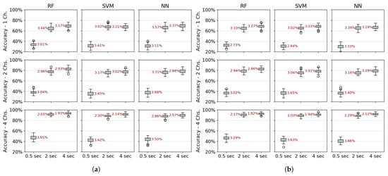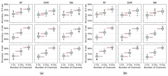 - Multiple configurations robustness test: Three different temporal windows (0.5, 2, and 4 s) and three channel configurations (1, 2, and 4 channels) are evaluated to assess model stability under varying acquisition conditions. For each configuration, only the feature extraction methods that achieved the highest performance in the global evaluation are considered. The three classification algorithms (RF, SVM, NN) are tested with 100 train–test partitions generated per setting. Performance is evaluated based on accuracy, recall, and precision.