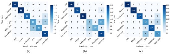 Confusion matrix for validation with 20 measurements per class evaluated across algorithms: (a) RF, (b) SVM, and (c) NN.