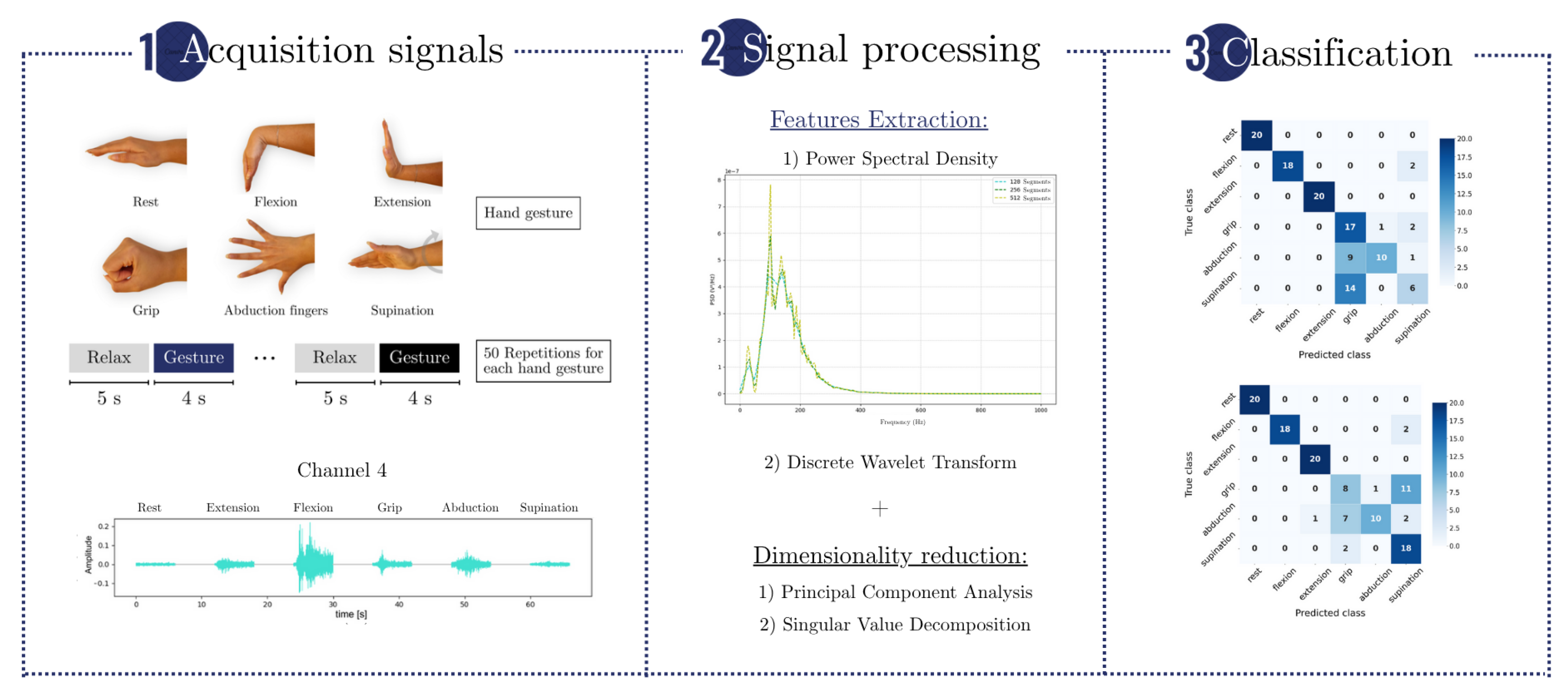 We implemented different feature extraction methods and classification algorithms to evaluate the accuracy of EMG signal classification as a function of acquisition times and combinations of measurement channels.