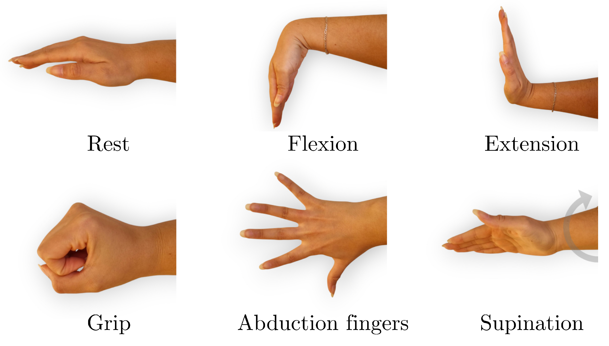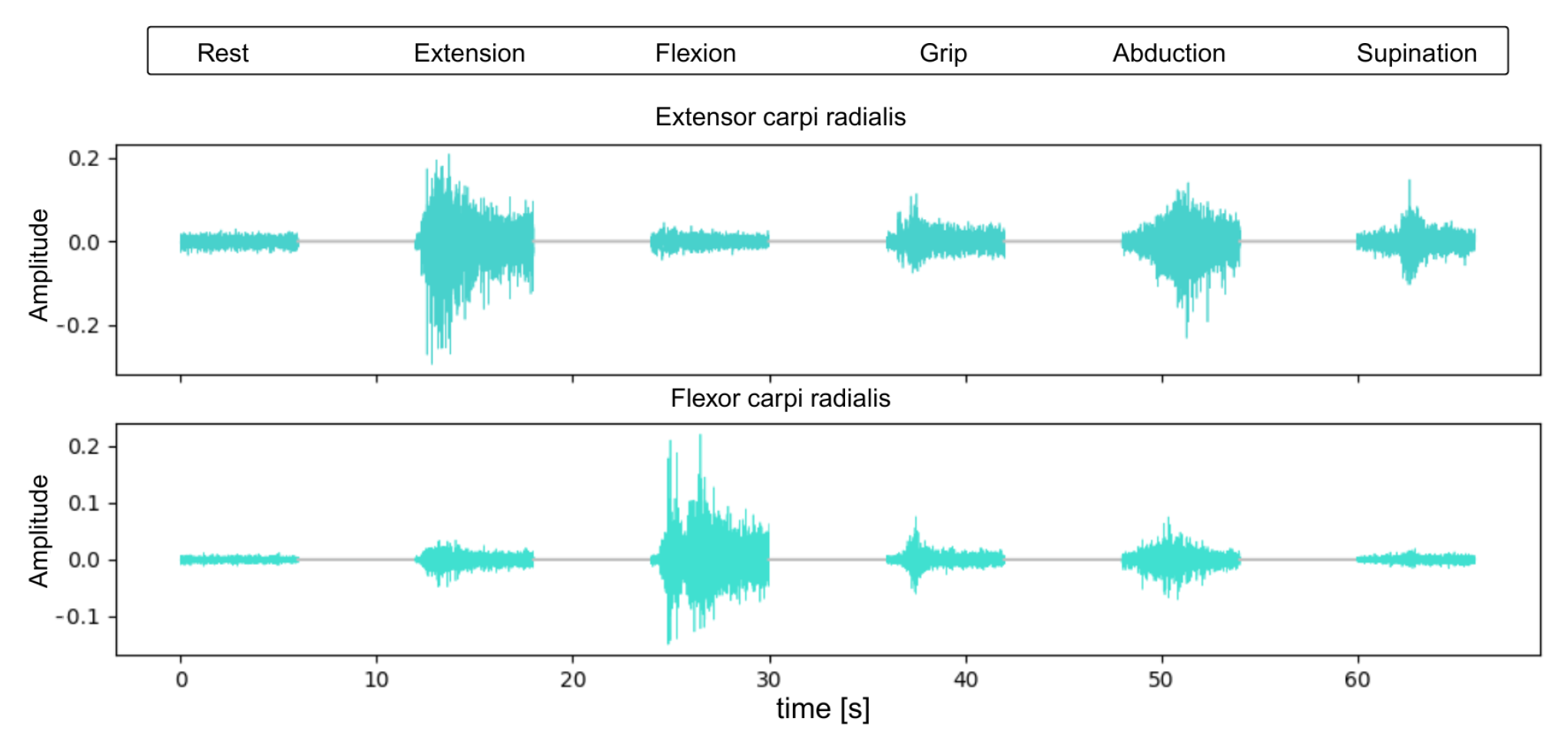 The data acquisition process consisted of recording EMG signals during six distinct hand gestures: rest, wrist extension, wrist flexion, grip, abduction of all fingers, and supination (