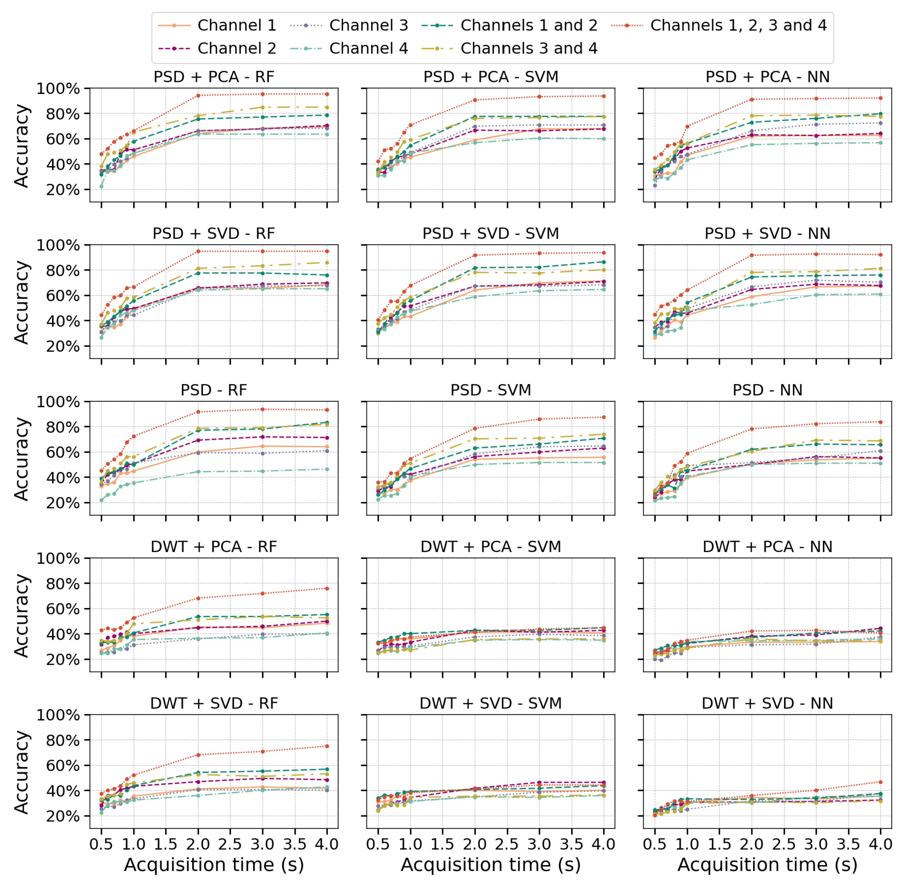 In the case of DWT+PCA or DWT+SVD, a notable decrease in accuracy is observed compared to PSD-based methods, likely due to the level of decomposition, which can introduce high dimensionality and redundancy in the wavelet coefficients. Interestingly, for shorter temporal windows, DWT performs comparably to other feature extraction methods regardless of the number of channels. However, as the acquisition time increases, its performance does not significantly improve, particularly for SVM and NN, where it remains notably lower than PSD-based methods. In contrast, RF achieves better results with DWT, reinforcing its lower sensitivity to irrelevant signal features. This suggests that the selected wavelet coefficients may contain redundant information, which RF mitigates through its ensemble learning approach, enhancing model robustness.