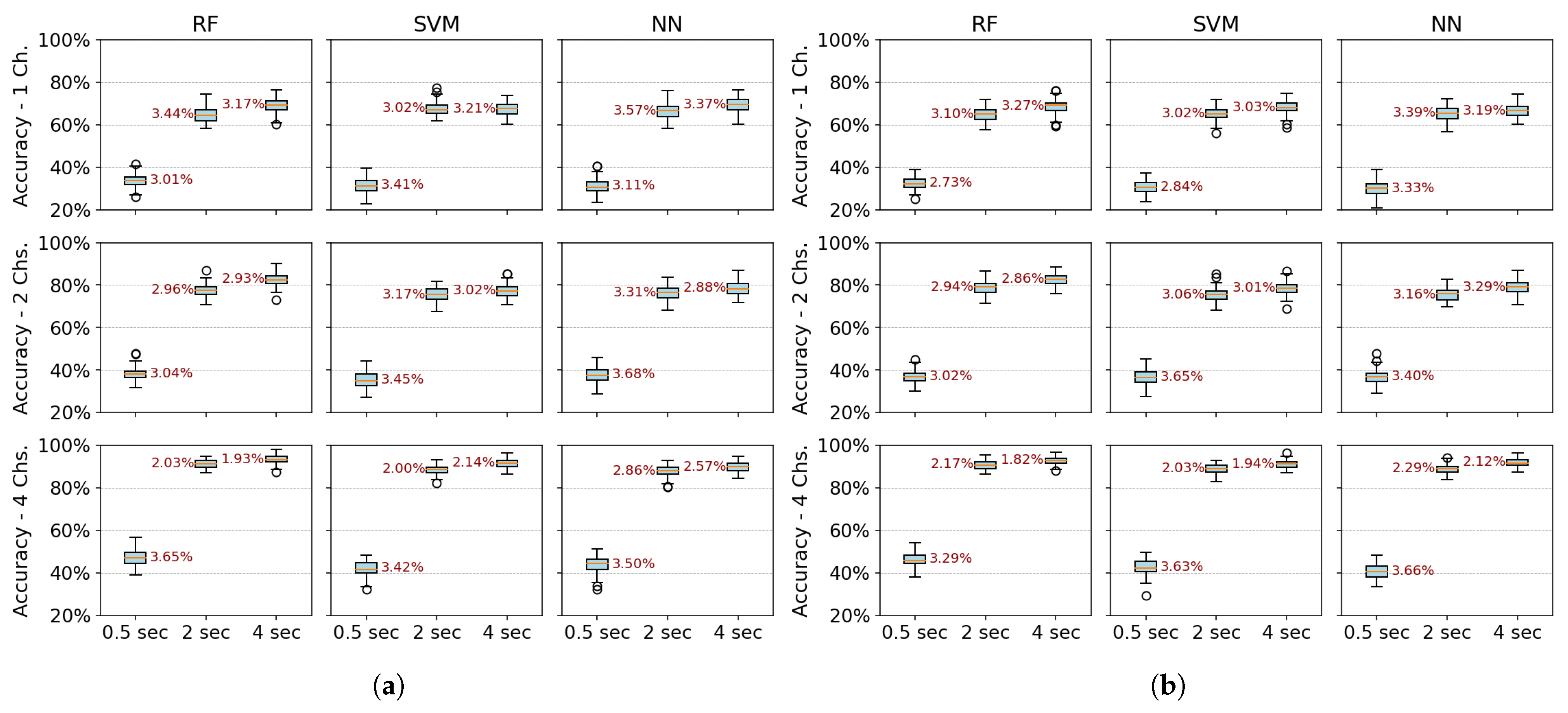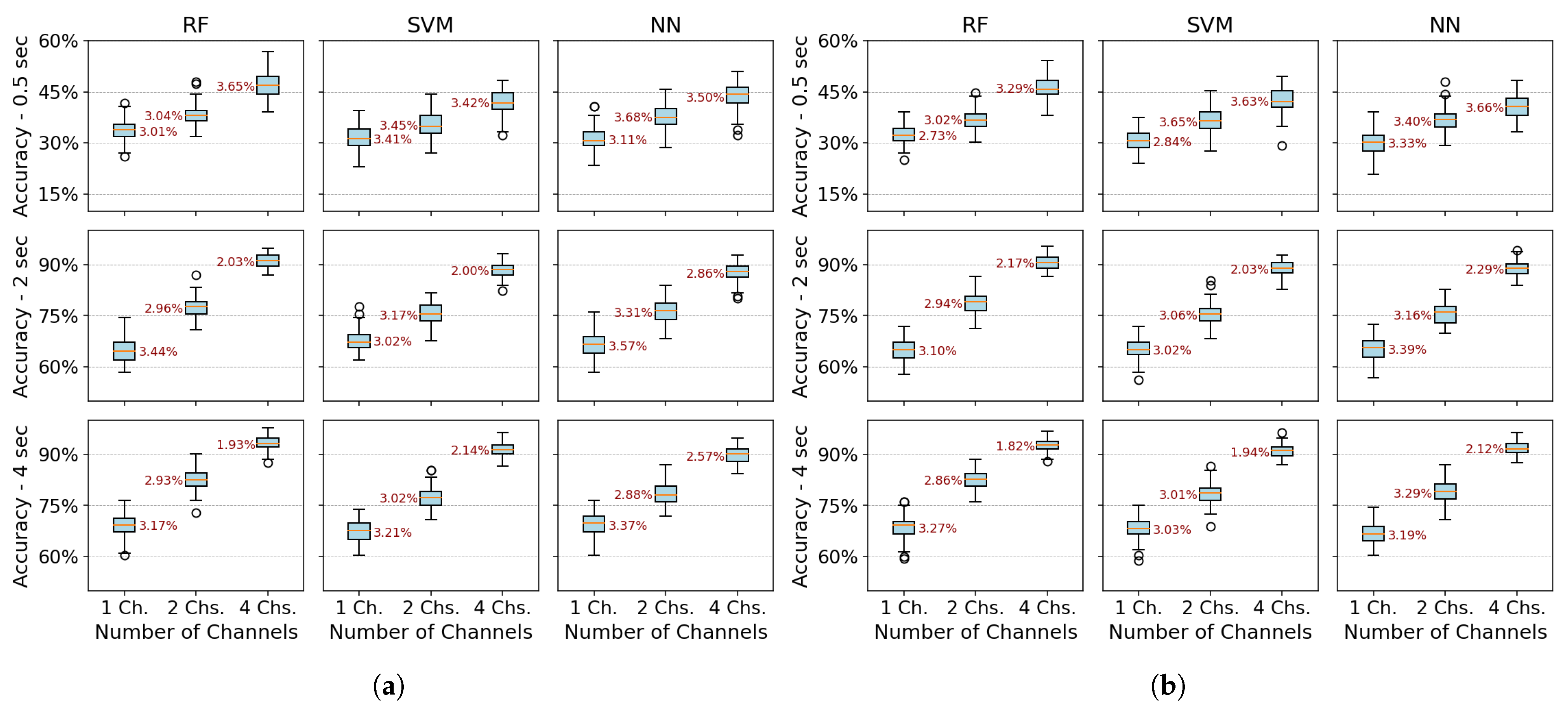 Figure 6 more clearly demonstrates that accuracy does not improve beyond 2 s of acquisition time. Furthermore, the data dispersion—reflected in narrow interquartile ranges—and the standard deviation remain stable after this point, showing no significant variations. With four channels, all algorithms show robust performance (low variability–CV: 2–3%). RF marginally outperforms SVM/NN in two-channel configurations. Single-channel data further amplify variability, underscoring the impact of spatiotemporal limitations on model stability.