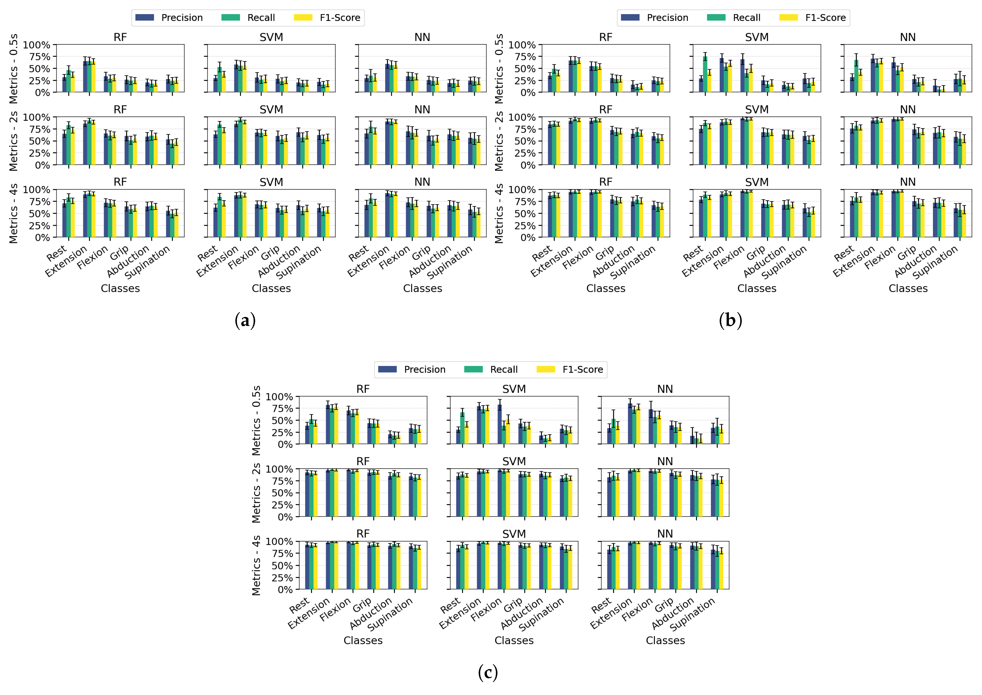 Extending the analysis to class-specific performance, wrist extension consistently outperformed other classes across all channel configurations (highest precision/recall/F1), which was attributable to the distinctive EMG signatures from extensor carpi radialis (channel 3). While multi-channel configurations improved the overall metric consistency, three limitations became apparent: (1) supination exhibited marginally lower performance than other classes even with optimal conditions (≥2 s windows and multi-channel spatial resolution), (2) finger abduction demonstrated degraded classification in short windows (0.5 s)—which was likely from suboptimal electrode positioning relative to intrinsic hand muscles, and (3) the rest class showed biased performance in SVM/NN (high recall but low precision) due to systematic confusion between inactive states and low-intensity movements. These findings indicate that while proximal muscle movements benefit from channel redundancy, reliable distal movement classification requires both anatomical electrode optimization and appropriate temporal windows.