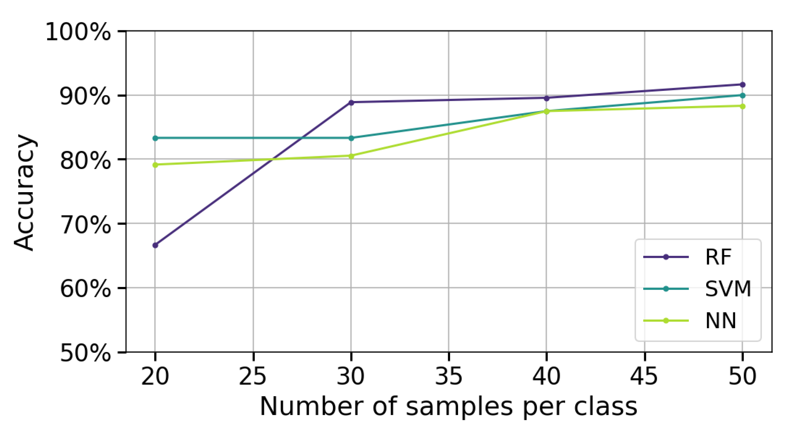 In this scenario, the number of measurements per gesture is varied (20, 30, 40, 50). The feature extraction method that showed the best performance in the previous analysis is applied. Subsequently, the three classification algorithms (RF, SVM, NN) are implemented, and the performance is assessed using the accuracy metric.