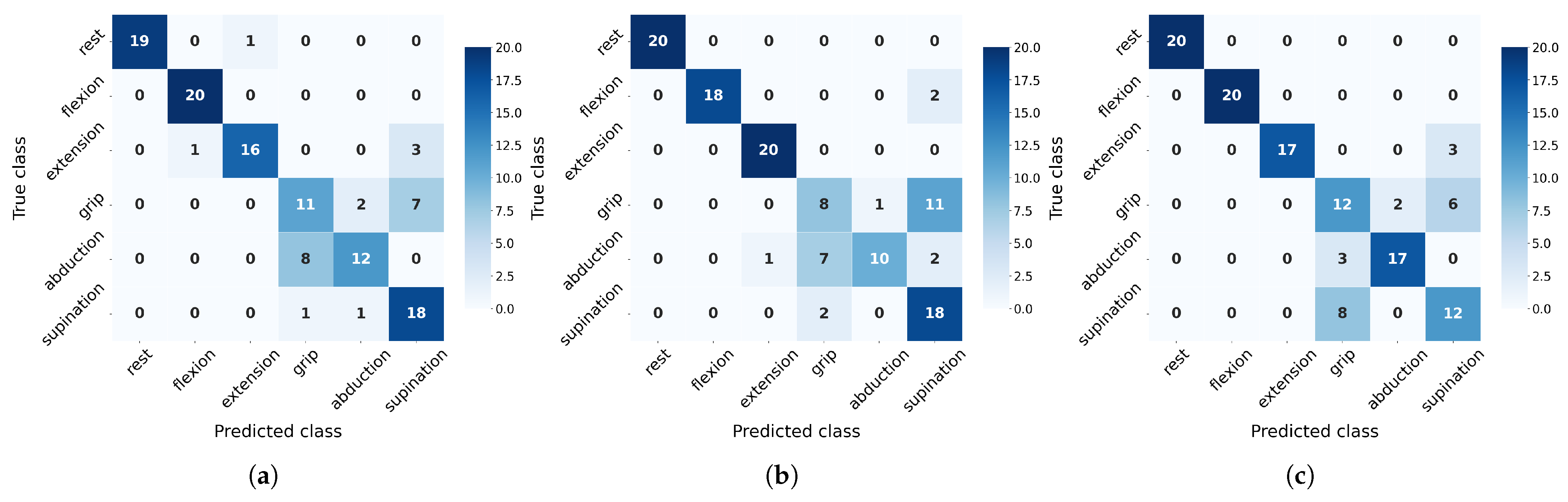 Figure 11) reveal distinct class-specific patterns across algorithms. Rest, flexion, and extension consistently achieve high F1-scores due to their distinctive EMG signatures, particularly benefiting from flexor carpi radialis activation (channel 4). In contrast, grip, abduction, and supination present greater challenges with their performance varying significantly by algorithms: SVM overpredicts grip (85% recall but 42% precision at 20 measurements) while struggling with supination (F1 = 39%), though the latter improves substantially with more data (F1 = 68%). NN shows opposite tendencies, severely underdetecting grip (20% recall) but overpredicting supination (90% recall, 55% precision). RF exhibits unique rest-class behavior (100% precision but 40% recall), suggesting conservative prediction patterns. Crucially, all algorithms show measurable improvement in problematic classes when increasing from 20 to 30 measurements, confirming that additional training data helps resolve ambiguous EMG patterns, though fundamental feature limitations remain for certain movements.
