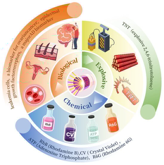 In recent times, the escalating frequency of bombing attacks has posed an unprecedented challenge to public security. Consequently, explosives detection has emerged as the epicenter of public security research endeavors. The ramifications of achieving rapid and precise detection of explosives are monumental, given the potential to thwart threats and safeguard lives and infrastructure. Against this backdrop, the advent of SERS technology has heralded a new era in explosives detection. Its unique strengths, particularly in discerning the molecular fingerprints of explosives, enable the detection of ultra-trace quantities and facilitate real-time identification. These attributes have rendered it an indispensable tool, affording highly efficient technical support across diverse scenarios such as security screening and forensic investigation [,].