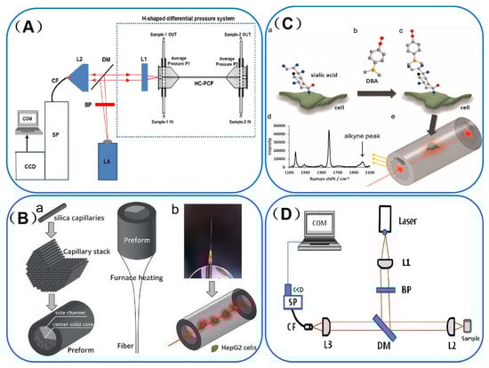 (A) Schematic of the setup. LA: Laser source with collimating lens; BP: Band pass filter; DM: Dichroic Mirror; L1: Microscope objective lens for light coupling; H-shaped differential pressure system with hollow core photonic crystal fiber; L2: Microscope objective lens for backward light collection; CF: Collection fiber; SP: spectrograph; CCD: CCD camera; COM: Computer. Adapted with permission from ref. []. (B) Scheme of SC-PCF sensor. Adapted with permission from ref. []. (C) Illustration of the detection method. Adapted with permission from ref. []. (D) Schematic of the set-up. L1: Collimating lens (shapes 785 nm excitation laser to initiate SERS); BP: Band pass filter (isolates laser wavelength); DM: Dichroic Mirror (separates excitation light and Raman signals); L2: Microscope objective (focuses laser onto HC-PCF sample to induce SERS); L3: Microscope objective (collects backward SERS signals); CF: Collection fiber (transmits SERS signals to spectrograph); SP: Spectrograph (disperses SERS spectra); COM: Computer (data acquisition/analysis). Adapted with permission from ref. [].