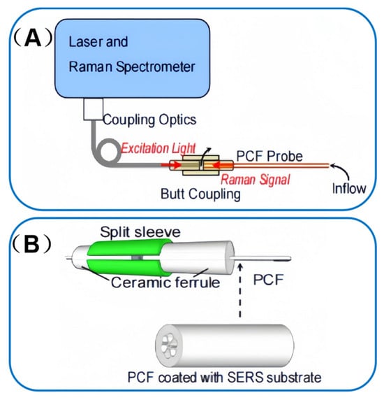 The development of PCF-SERS probes suitable for ultra-sensitive and in situ detection is a topic of significant scientific interest. Two important optical designs have been explored. In the original design, the optical fiber serves as a single waveguide for both light transmission and collection of Raman scattering signals from various SERS-active substrates. This particular configuration is commonly referred to as an external fiber-optic SERS sensor []. On the other hand, the second approach, known as intrinsic fiber-optic SERS sensors, involves integrating metallic SERS-active nanostructures directly with the optical fiber, typically at its tip. In this design, the fiber-optic probe functions both as a waveguide for light transmission and as a platform for SERS activation [,]. This integration not only enhances the interaction between light and matter but also significantly improves the sensitivity and spatial resolution of the sensor, thereby offering new possibilities for ultrasensitive detection and in situ analysis. While PCF is already a powerful type of optical fiber, PCF-SERS sensors provide exceptional versatility and have had a transformative impact on several key applications.