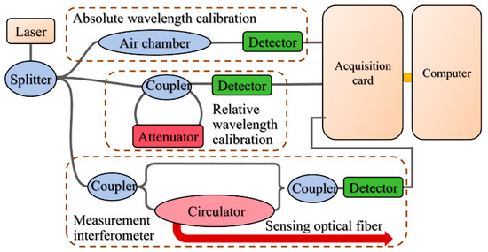 Optical fiber sensors exhibit numerous advantageous characteristics, including small volume, low weight, strong integrability, and adaptability to extreme environments. They are widely employed in structural monitoring across fields such as medicine, aerospace, civil engineering, and automotive engineering [1,2,3,4,5,6,7,8,9]. An optical fiber primarily consists of three components: the core, the cladding, and the outer coating [10]. When an optical fiber is situated in an external strain field or temperature field, variations in strain or temperature induce changes in the fiber’s internal refractive index, which in turn alter the corresponding Rayleigh scattering signal. By measuring the optical frequency of this signal, the detection of strain or temperature variations can be realized.