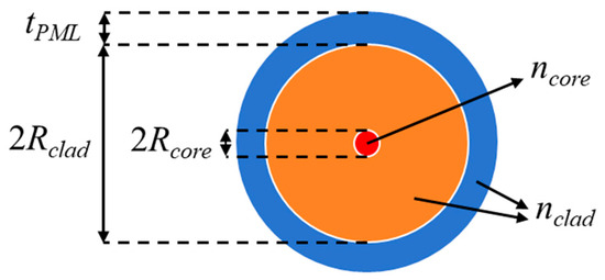 The simulation model employs a core-cladding infinitely extended structure. The bent optical fiber exhibits central axial symmetry, and the entire fiber can be generated by rotating a specific cross-section. To investigate the influence of bending radius on optical loss, the bending radius is treated as a variable parameter via parametric modeling. A scattering boundary condition is applied to the outer boundary of the fiber cladding to absorb the optical field that is vertically incident on the boundaries of the cladding. A perfectly matched layer (PML) is adopted to mimic an “infinite cladding”. To enhance the accuracy of the simulation results, an ultra-fine mesh size is employed. The finite element model is illustrated in Figure 3.