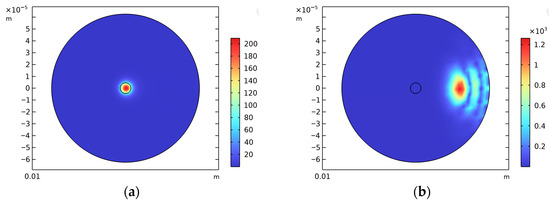 Figure 4 shows the simulated electric field distribution of the optical fiber. Different modes correspond to different effective refractive index results: as presented in Figure 4a, the electric field is confined within the fiber core, which corresponds to the fundamental mode; in Figure 4b, the electric field is concentrated in the cladding, which is identified as a pseudo mode. Using the imaginary part of the effective refractive index under the fundamental mode, the optical loss per bend loop (in dB/loop) at the given bending radius can be calculated via Equation (8) [29]: