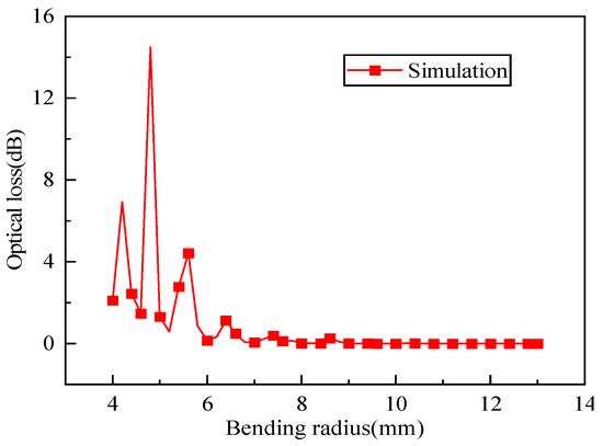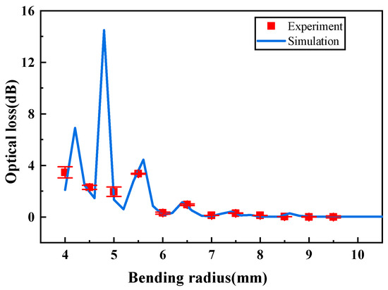 The optical loss per bending loop under different bending radii was measured experimentally, with the results shown in Figure 7. It can be seen that the experimental results are in good agreement with the simulation results, and the variation trend of optical loss with the fiber bending radius is consistent, thus verifying the reliability of the finite element simulation model.