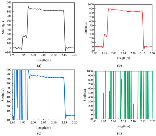 Figure 12 illustrates the strain measurement results under the conditions of a constant load (2 N), a fixed bending radius of 6 mm, and varying numbers of bending loops. For the OBR series produced by Luna, the system background noise is expressed in terms of sensitivity, which is approximately −118 dB/mm. In contrast, the Rayleigh scattering signal intensity of standard SMF-28 optical fiber is −100 dB/mm. Given this, the bidirectional limit for optical fiber loss must not exceed 9 dB [30]. As can be seen from Figure 8, when the bending radius is 6 mm, the optical loss corresponding to 10 bending loops is still less than 9 dB; therefore, the influence of bending loss on signal quality remains at a low level. This low-loss condition leads to a high SNR of the strain signal.