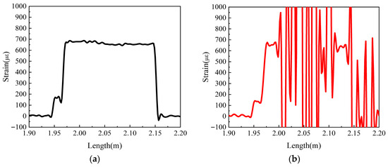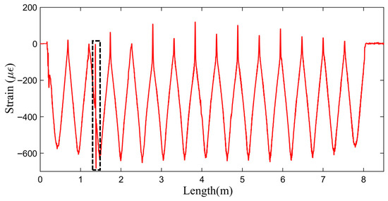 Under three-point bending, the distributed optical fiber provided continuous strain measurements at the honeycomb/panel interface, as depicted in Figure 14. The demodulated signals show high clarity, free from significant noise and with a high SNR. A pronounced strain transition is evident in the fiber segments crossing the debonding region (as indicated within the black dashed box). This result confirms the feasibility of the multi-bend sensor deployment strategy and its reliability in delivering high-SNR strain monitoring.