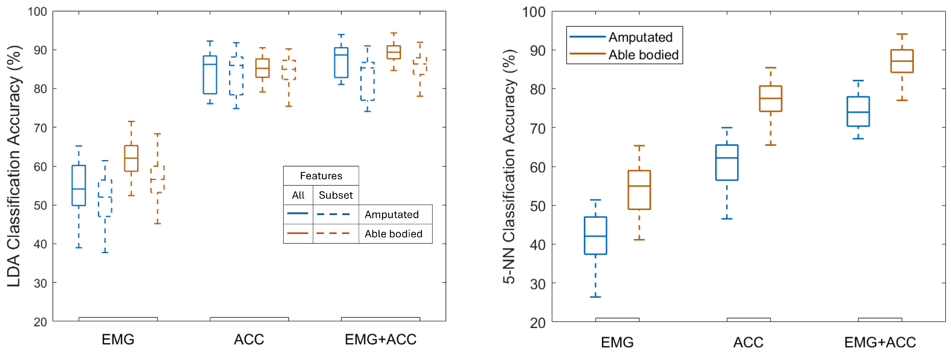 Figure 3). Specific LDA classification accuracy values varied by sensor modality and participant group. Using EMG alone achieved 62.0% mean accuracy for able-bodied participants and 54.1% for those with amputation. ACC alone achieved 85.0% and 84.4% respectively, and using EMG+ACC resulted in mean accuracies of 89.1% and 87.5% respectively. Results obtained with the KNN model showed a similar pattern, with the ACC and EMG+ACC modalities outperforming EMG alone. Across all subjects (both groups), the average KNN accuracy was 47.7% when trained with EMG only, 68.7% when trained with ACC only, and 80.6% when trained with both EMG and ACC combined (