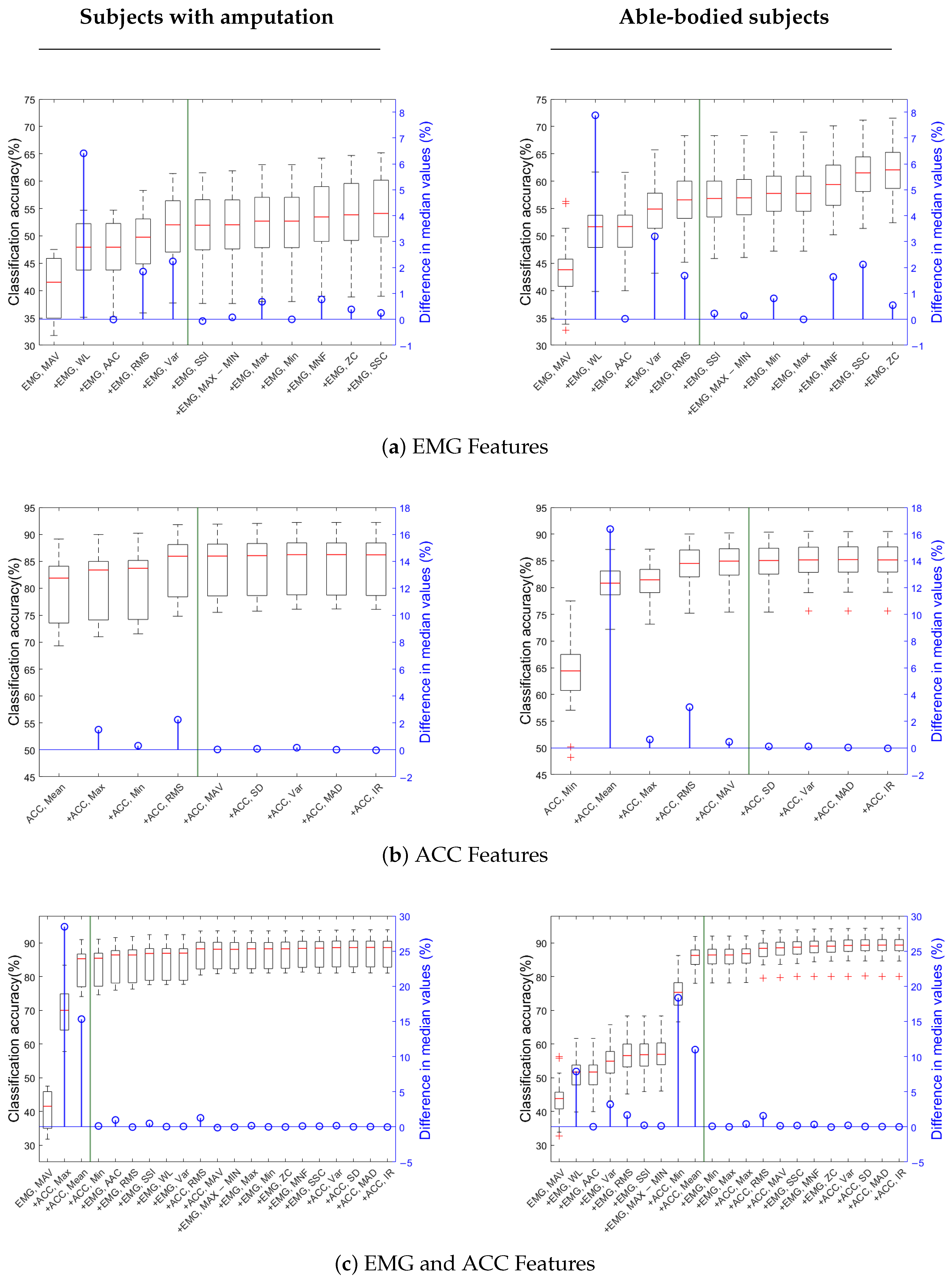 Figure 4b). When EMG and ACC features are combined, only three features overall are enough to obtain high enough classification accuracy in participants with amputation. In this group, the first feature is MAV from EMG data, while the next two top features are ACC ones. For the able-bodied group, nine features were selected, including both EMG and ACC ones (