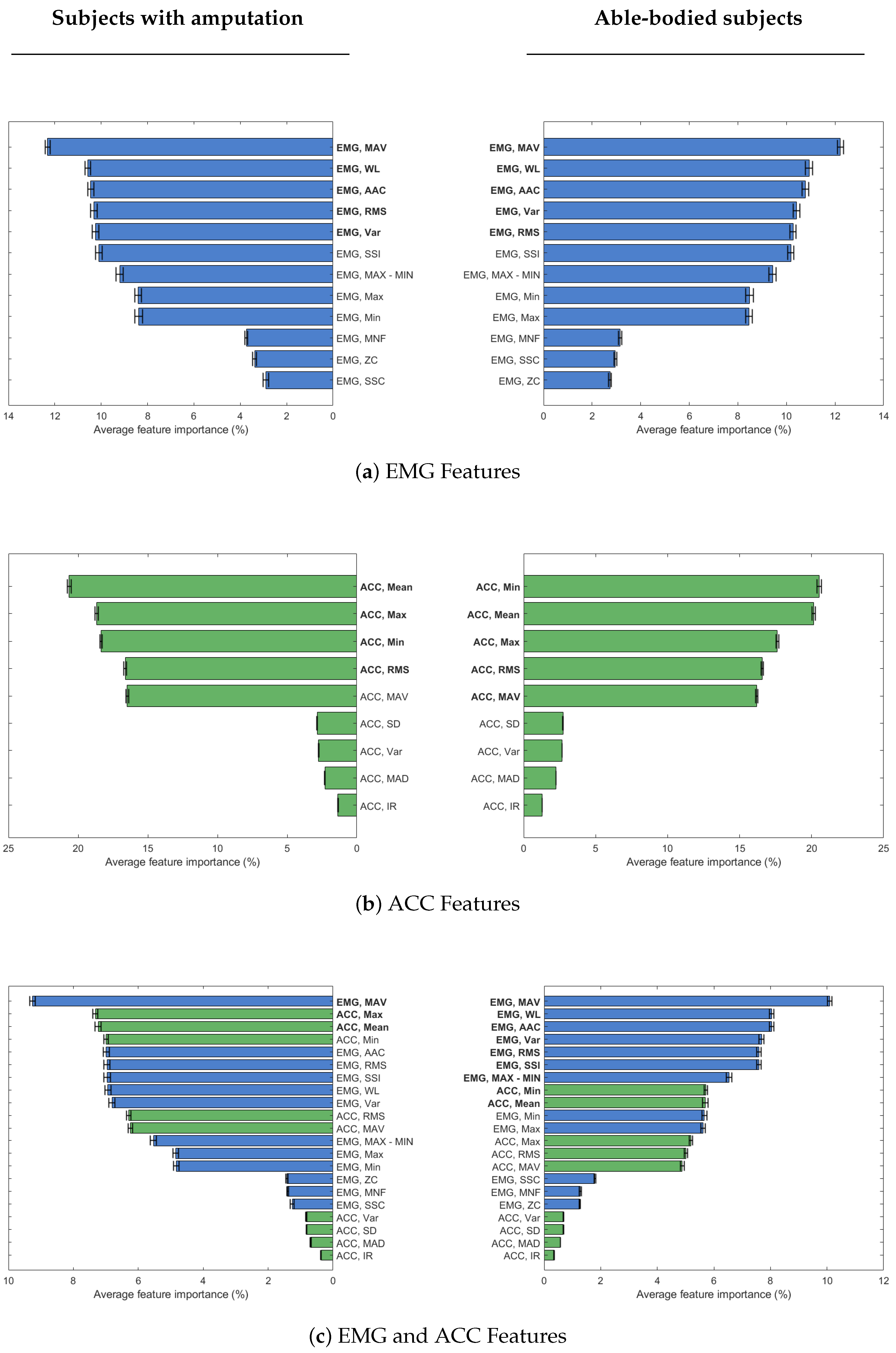 Figure 4a). For ACC data, selected features are similar across both participant groups, but the order of importance differs. MAV, in particular, is selected only for able-bodied participants, because of the difference adding this feature made in classification accuracy (