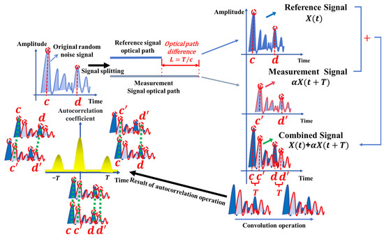 Here, describes the reference optical signal in the time domain, serving as the original waveform. The coefficient quantifies the amplitude reduction experienced by the measurement signal relative to the reference. The crucial parameter represents the optical time delay incurred by the measurement signal as it travels the additional round-trip path to the target. Finally, is a variable time shift introduced in the autocorrelation process. By identifying the peaks in the correlation function, the delay is determined through convolution operations.