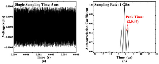 Under the condition of a set delay time = 2 μs with a sampling rate of 1 GS/s, a combined signal lasting 5 ms (corresponding to the single sampling duration) was generated for simulation verification. Figure 2a clearly demonstrates the time-domain characteristics of the original random noise signal, while Figure 2b shows distinct conjugate symmetric peaks in the autocorrelation function curve of the combined signal. Through precise extraction, the delay amounts corresponding to the symmetric peaks were determined to be −2 μs and 2 μs, respectively, which completely match the preset parameters, thereby fully validating the theoretical feasibility of the method.