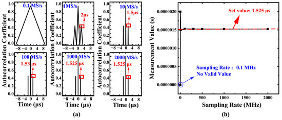 (a) Influence of sampling rate on the position of the autocorrelation peak (Fixed parameters: T = 1.525 µs, duration = 10 µs). (b) Measure the relationship between the absolute deviation and relative error of time delay and the sampling rate. As the sampling rate increases from 0.1 MS/s to 2000 MS/s, the absolute deviation between the measured delay value and the theoretical delay value decreases monotonically, and the maximum relative error drops from 31.15% to 0%.