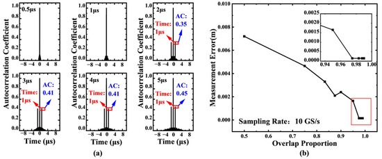 (a) System performance under different storage depths with fixed sampling rate (100 MS/s). When the storage depth (acquisition duration) is less than the delay (1 μs), the system fails to detect the delay peak. Effective detection is achieved when the storage depth increases to 2–5 μs, validating the fundamental constraint for unambiguous ranging. (b) Influence of signal overlap ratio on measurement error. As the overlap ratio increases, the measurement error decreases rapidly before stabilizing, confirming that a higher overlap ratio enhances the signal-to-noise ratio of the autocorrelation peak. Simulation parameters: delay = 10 ns, sampling rate = 10 GS/s.