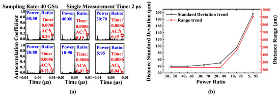(a) Influence of different splitting ratios on the autocorrelation peak.Measured ranging accuracy under different reference-to-signal optical power ratios (from 50:50 to 5:95).; (b) Variation trend diagram of standard deviation and range of measurement results under different splitting ratios. The results demonstrate that a power ratio close to 1:1 yields optimal performance, minimizing both the standard deviation and range of fluctuations.