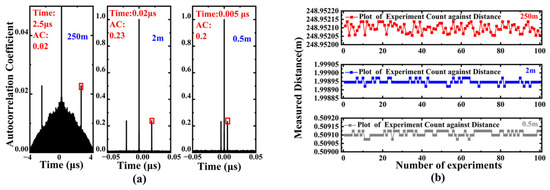 To mitigate the impact of low overlap ratio, the single measurement time for the 250 m case was increased to 40 µs, achieving an overlap ratio of 93.75%. After repeating the measurement 100 times, the results shown in Figure 8b indicate that the standard deviation decreased to 28.64 µm. This demonstrates that under consistent conditions, the method can maintain stable measurement performance across different distances. Due to limitations in the laboratory’s computational capabilities, the overlap ratio could not be further increased to 99%. It should be noted that during data processing, to account for the characteristic that the time of flight in practical measurements includes both the emission and return times, the aforementioned 0.5 m, 2 m, and 250 m distances correspond to actual fiber lengths of approximately 1 m, 4 m, and 500 m, respectively. During processing, the delay time obtained through autocorrelation calculation was halved to conform to the actual time-of-flight characteristics. Therefore, the delay times appearing in the autocorrelation spectrogram correspond to 1 m, 4 m, and 500 m.