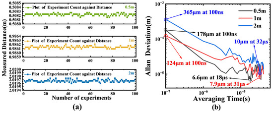 Different from the verification experiment with the time-delay line, the signal light emitted by the probe can be affected by various environmental factors, which may lead to measurement failures. Therefore, based on the probe-based measurement system and the existing laboratory conditions, we set measured distances of approximately 0.5 m, 1 m, and 2 m to test the measurement performance of the system at different distances. The measurement duration for a single test was 4 μs, and the measurement was repeated 100 times. Finally, the measurement results for 0.5 m, 1 m, and 2 m are shown in Figure 10a. The standard deviations corresponding to the three groups of distances are 22.11 μm, 22.25 μm, and 32.36 μm, respectively. To conduct a stability analysis of the measurement system, we evaluated the Allan Deviation. The entire measurement consists of 4000 independent data points, with each point being collected over a time of 100 ns, and the total duration is approximately 400 μs. The extracted Allan deviation is shown in Figure 10b. At an average time of 100 ns, the Allan deviations for 0.5 m, 1 m, and 2 m are 178 μm, 124 μm, and 365 μm, respectively. Subsequently, these three values decrease to 6.6 μm, 7.9 μm, and 10 μm at average times of 18 μs, 31 μs, and 32 μs, respectively. At relatively short average times, the Allan deviation decreases as the average time increases.