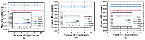 Displacement resolution tests from different initial positions: (a–c) Fluctuation of measured displacements with 0.5 m, 1 m, and 2 m as initial positions. The system was tested for 5 mm, 1 mm, 500 µm, and 100 µm movements. With a 40 µs single-measurement time, the maximum standard deviation across all tests was 8.17 µm.