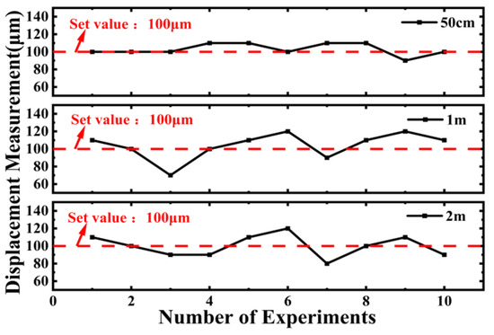 At the same time, as can be seen from the error fluctuations in Figure 12 when moving 100 μm from the initial positions of 50 cm, 1 m, and 2 m, the maximum error value is 30 μm and occurs at a measurement distance of 1 m. Therefore, this method of measurement not only has good stability but also the error value does not increase with the increase in distance, providing the possibility for fast precision measurement.