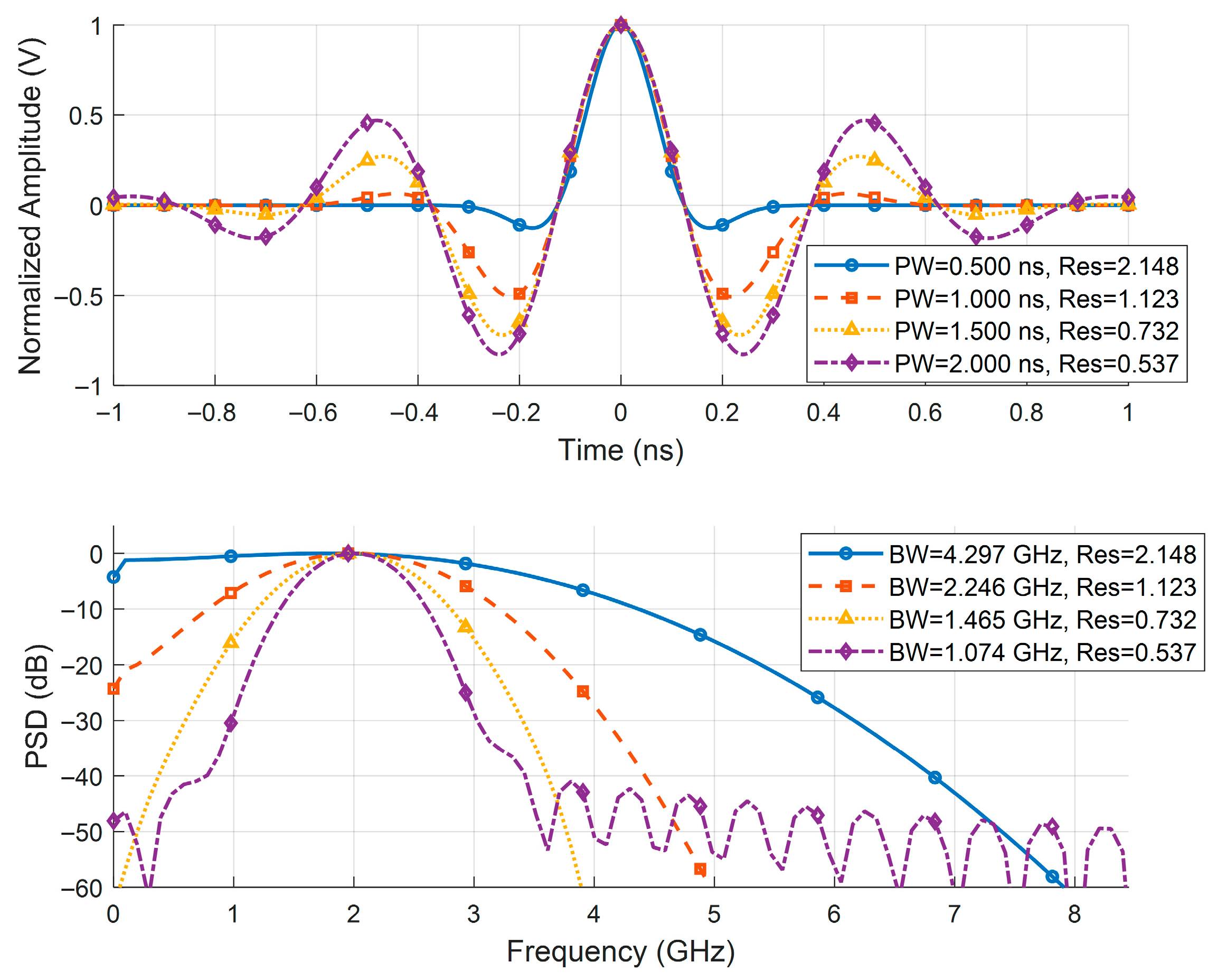 To systematically evaluate the algorithm’s performance across varying resolution factors, this study maintains the quasi-periodic structure of the channel (i.e., fixes the minimum path separation ) and achieves continuous control over by adjusting the effective bandwidth of the source signal . Specifically, based on Equation (40), the time-domain pulse width of is progressively broadened while holding its center frequency constant. Leveraging the time-bandwidth inverse proportionality principle of the Fourier transform, this operation generates a series of source waveforms with distinct system resolutions. Finally, convolving these resolution-varying source signals with a fixed CIR produces a comprehensive test dataset spanning from the resolvable region to the super-resolution region.