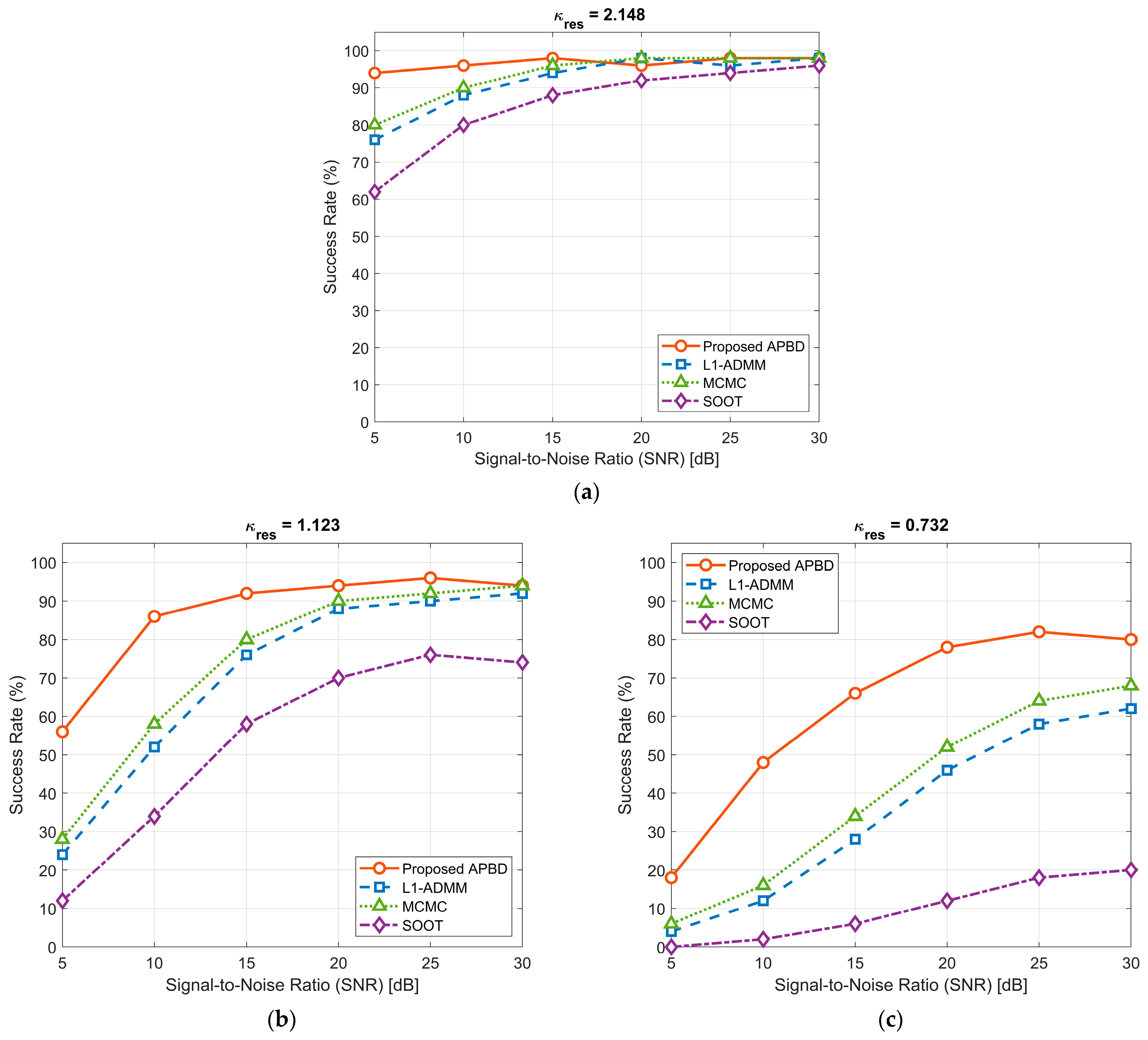drops below 1, the ill-posedness of the problem intensifies, and performance differences become pronounced. L1-ADMM and MCMC, which rely on generic random sparsity priors, struggle to stably separate closely spaced paths under highly correlated sensing matrices, leading to a rapid decline in success rates. SOOT performs the worst due to fundamental mismatches between its physical model and the temporal structure of the channel. In contrast, the proposed algorithm employs a periodic-structure projection operator to precisely constrain the solution space onto the correct low-dimensional manifold. Even in the deep super-resolution scenario of