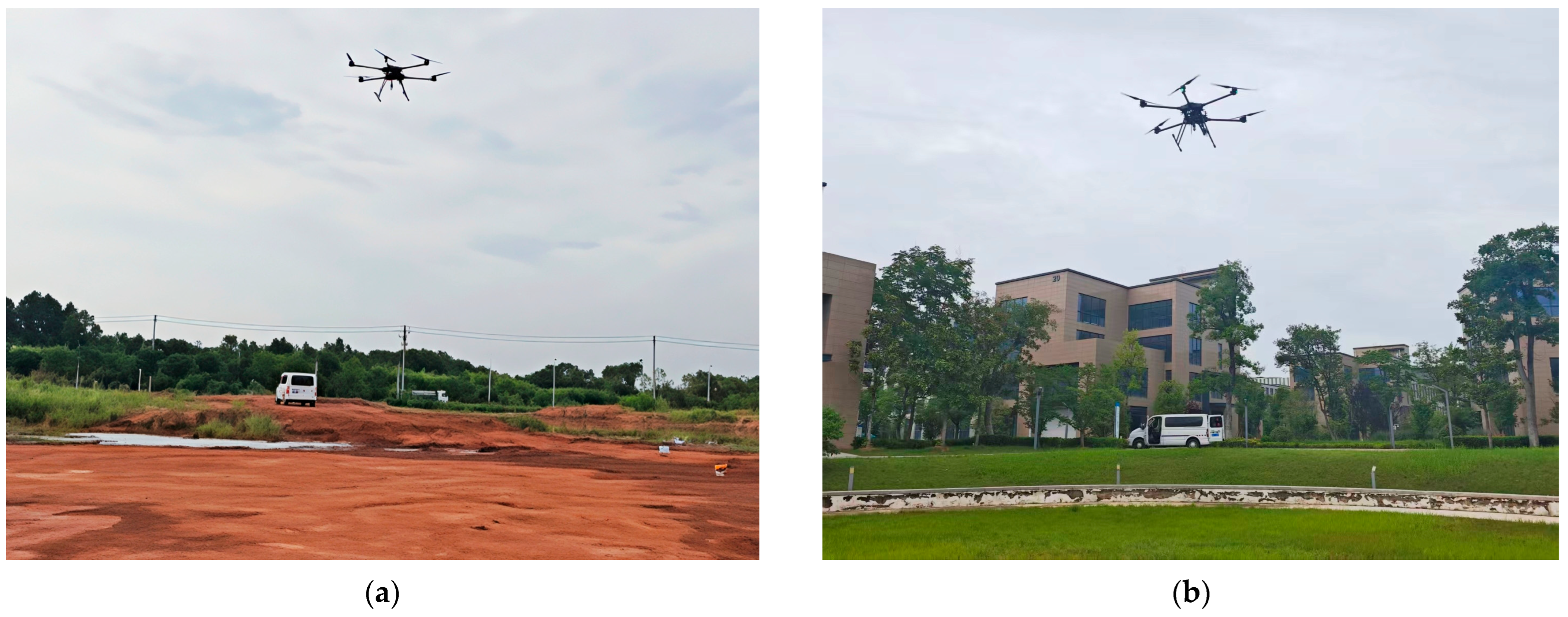 For validation on measured data, a comprehensive dataset was acquired using a UWB fuze system. The system’s receiver architecture is based on ETS, which leverages Doppler frequency shift for high-resolution waveform reconstruction. To generate the required relative motion during experiments, the fuze system was mounted on an unmanned aerial vehicle (UAV) that executed vertical descent maneuvers over the ground targets, simulating terminal engagement scenarios. A total of 20 independent measurements were acquired for each of two distinct ground surfaces: a smooth soil ground referred to as Surface A, and a grassland referred to as Surface B. The final segment consisting of 870 samples, recorded at a sampling frequency of 2.5 kHz, was retained from each measurement for subsequent analysis (see