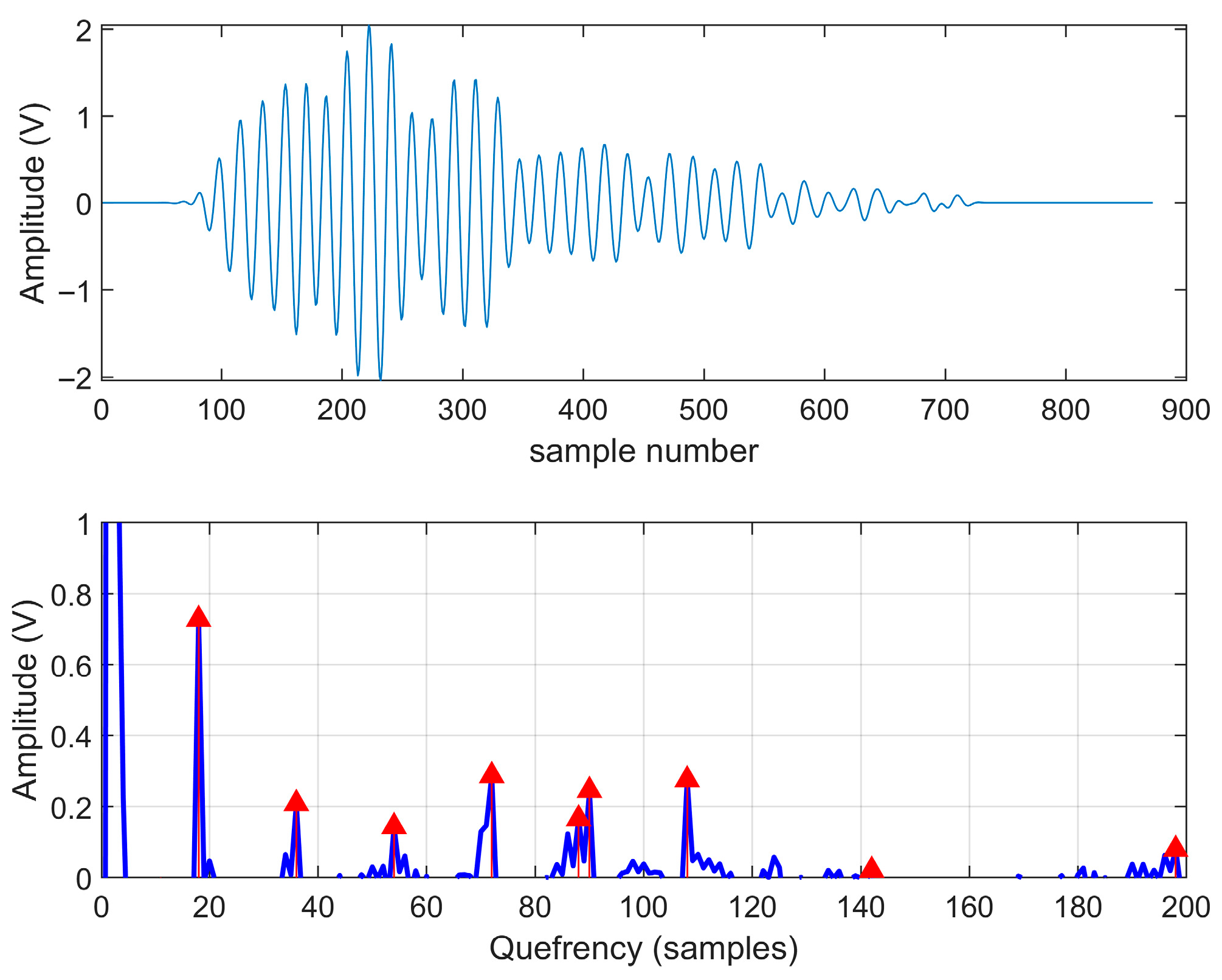 It can be observed that in the low-quefrency region of the cepstrum, there exists an isolated dominant peak with highly concentrated energy, a feature consistent with the cepstral morphology of short-duration, aperiodic pulses. In the high-quefrency region, the cepstrum exhibits a series of distinct and approximately equally spaced harmonic peaks, as marked by the red triangles in