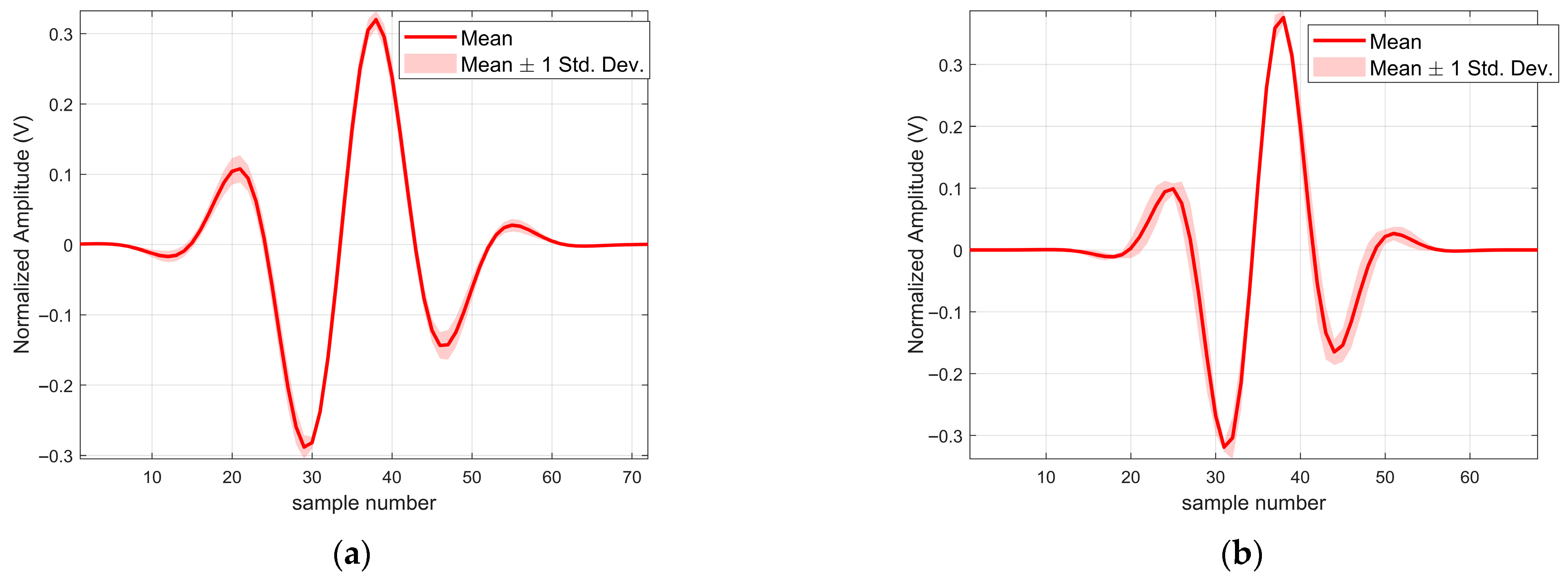 Figure 10a,b) demonstrate a high degree of consistency, clustering closely around their respective clear average waveforms (solid red lines). Moreover, a comparison of the average waveforms for the two ground types reveals a strong similarity in both waveform structure and envelope morphology (see