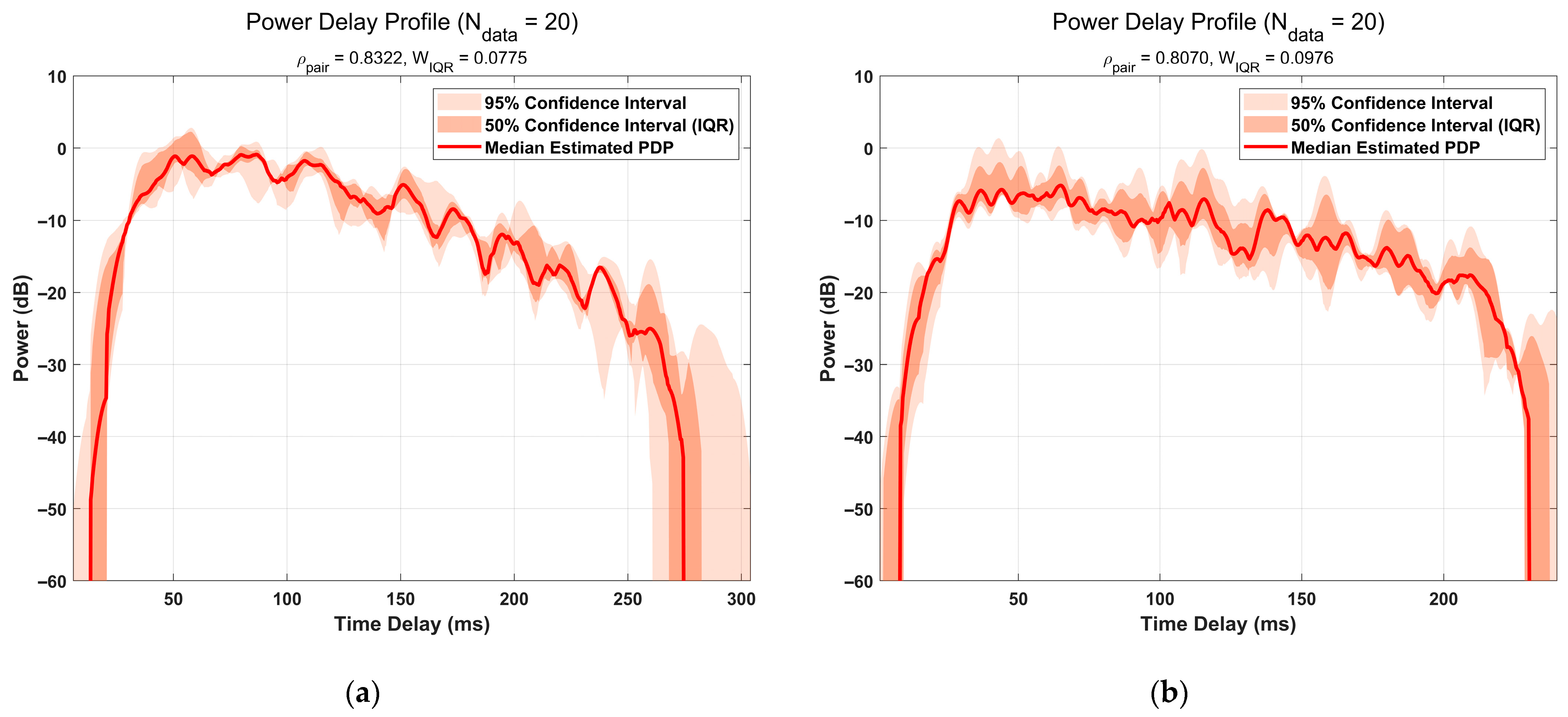 Figure 10 shows a high visual consistency of the PDPs for both ground types. To quantify this consistency and the fine-waveform similarity of the CIRs, respectively, the relative IQR width of 20 PDP measurements and the average pairwise correlation coefficient of 20 CIR measurements were computed. The results are summarized in
