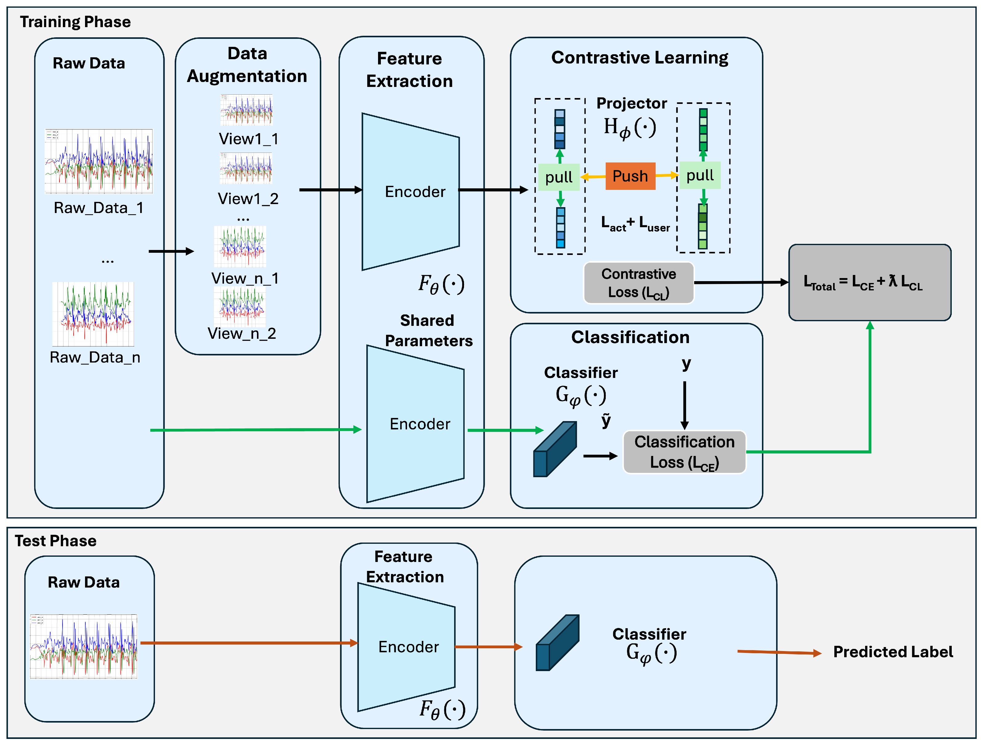 - SupCon (Act Only, Two-stage): Supervised contrastive learning using only activity labels to construct positive and negative pairs (Figure 3b). The encoder is then frozen, and a classifier is fine-tuned on the fully labeled dataset.