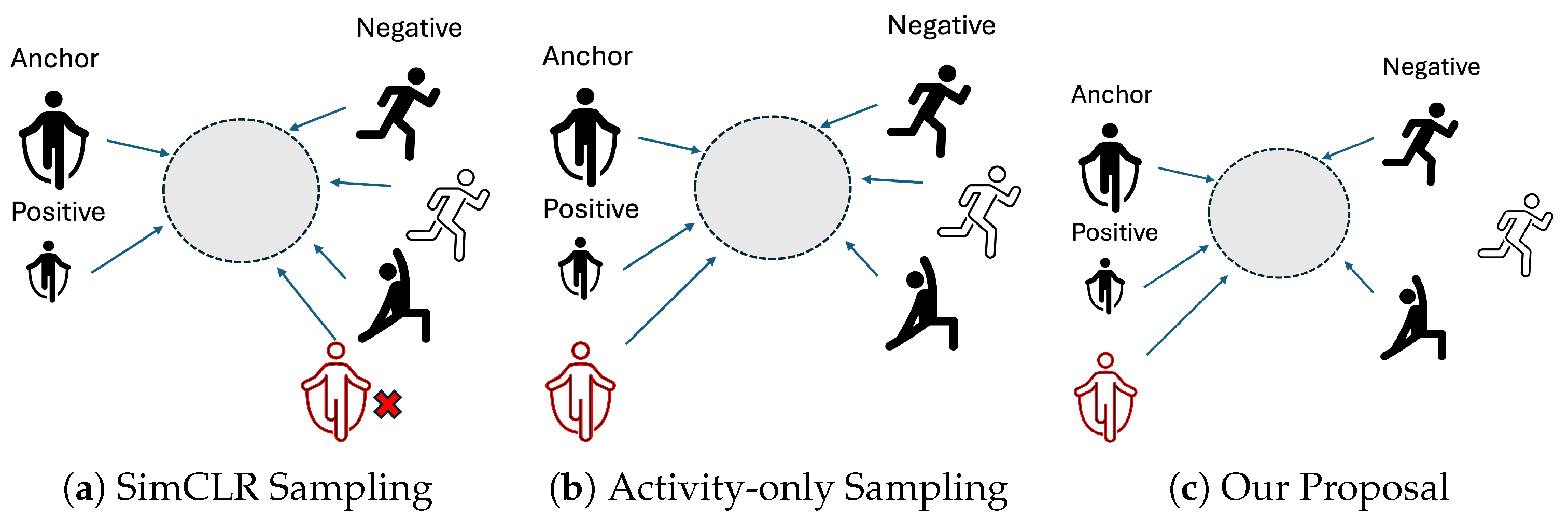 - SupCon (Act + User, Two-stage): A stricter version of SupCon, in which both activity and user labels must match to form positive and negative pairs (Figure 3c).