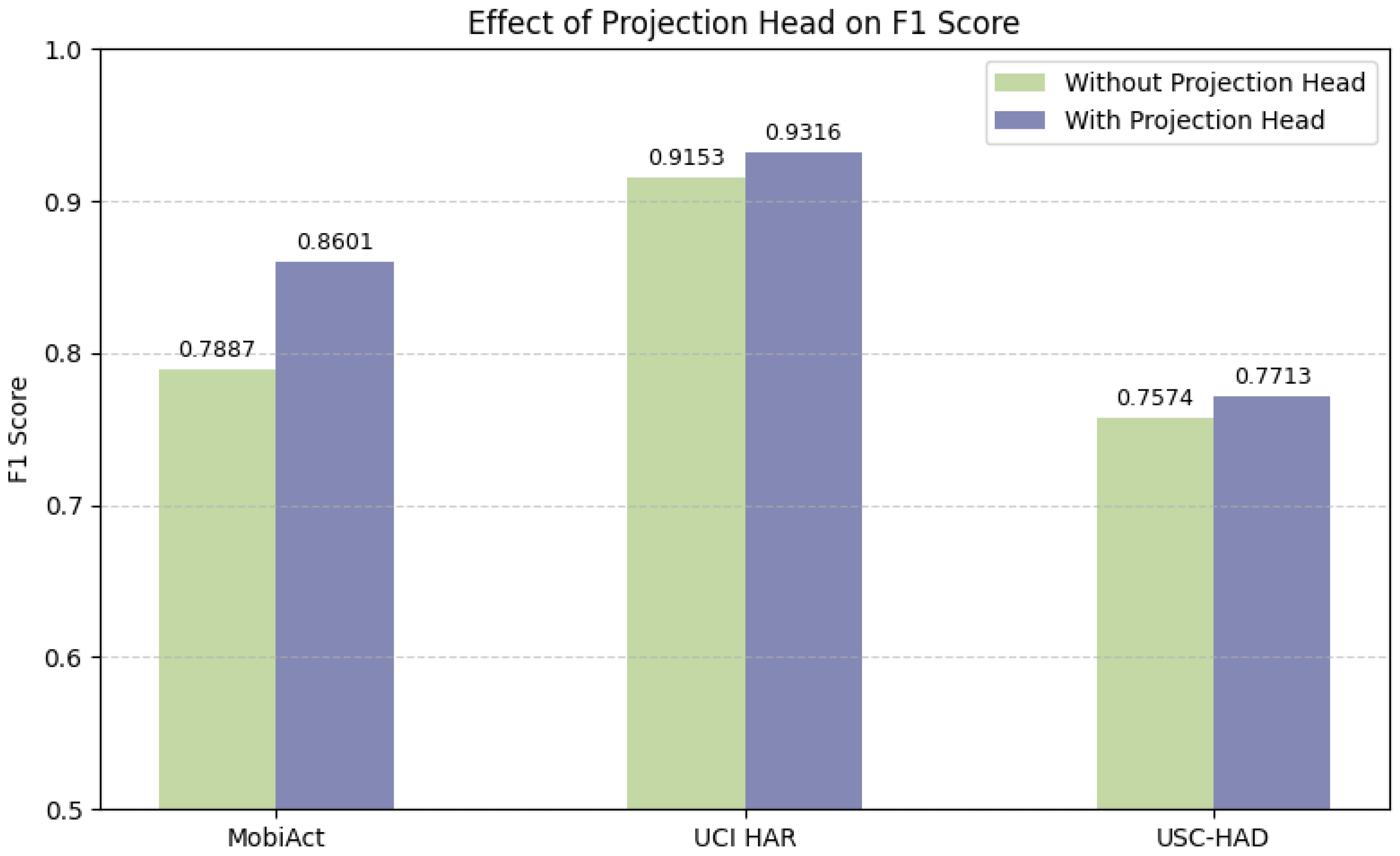 - Supervised contrastive learning (SupCon) achieves higher performance than self-supervised contrastive learning (SimCLR), indicating that label supervision is beneficial for wearable HAR tasks.