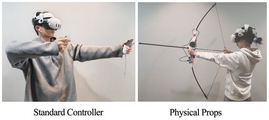 Archery serves as an ideal paradigm for investigating VR interaction and immersion. It inherently combines vibrotactile, force, and kinesthetic feedback, demanding high levels of precision, force control, and adaptation [,]. Its established use in both VR training [,,,] and entertainment [] provides a robust foundation for this study. Specialized hardware interfaces are pivotal for creating realistic VR archery experiences. Previous research has explored diverse technological pathways. For instance, some systems use a real recurve bow integrated with multiple sensors (e.g., reed sensors, laser, Kinect) to detect drawing and releasing, but at the cost of increased system complexity and setup []. Others employ high-precision custom devices with strain gauges, focusing on physical accuracy over immersive experience []. Conversely, approaches using data gloves or purely virtual interactions avoid physical props altogether, thereby lacking realistic tactile resistance feedback []. Crucially, there is a lack of validation regarding how these physical prop interfaces and their associated sensor modalities concretely impact user performance and experience.