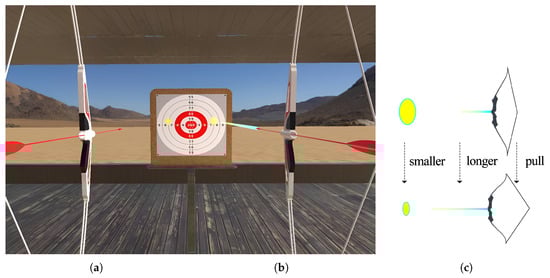 When physics-associated visual feedback is enabled, during the aiming phase, the system generates a semitransparent trajectory line at the arrow tip, which dynamically extends along its straight path. This trajectory line is completely straight and unaffected by simulated gravity or wind. Simultaneously, a circular crosshair is displayed at the intersection of this trajectory line and the target plane (Figure 4b). The length of the trajectory line and the radius of the crosshair are dynamically adjusted according to the draw distance: as the draw distance increases, the trajectory line visually lengthens, while the radius of the crosshair decreases (Figure 4c). This real-time synchronization ensures that the visual feedback is consistent with the physical force feedback originating from the bow, hence the term physics-associated visual feedback. Specifically, the draw distance is mapped to the pull of the virtual bow, which in turn affects the simulated speed and trajectory of the arrow. The actual trajectory of the arrow is affected by gravity and wind, so the trajectory shown in the visual feedback is completely different from the actual trajectory of the arrow. Participants need to use their skills to predict the movement of the arrow, which is the main difficulty of this archery task.