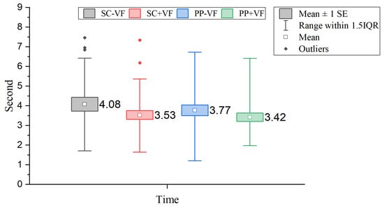 In this study, we conducted comprehensive statistical analyses of participants’ performance across four experimental conditions, encompassing objective metrics such as hit deviation, task completion time, and hand tremor. To ensure data representativeness and accuracy, all statistical evaluations were based on data from all individual shooting trials during the formal experiment. We collected 33 sets of objective behavioral data from 33 participants, including 10 shooting trials per participant under each condition. The mean hit deviation across each participant’s ten shots was utilized to represent their personal hit deviation and included in subsequent statistical analyzes. Similarly, the mean task completion time and mean hand tremor across the ten trials were calculated for each participant and used in the statistical analyses. Figure 5 illustrates the distribution of all raw hit deviations (i.e., every individual shooting trial across all participants and conditions). It can be observed that the border of the hit deviations is generally wider in the physical prop conditions (PP − VF and PP + VF) compared to the standard controller conditions (SC − VF and SC + VF). Moreover, the presence of visual feedback seems to reduce the border of the hit deviation in the standard controller condition (SC − VF vs. SC + VF), and the observed difference is weaker under the physical prop condition (PP − VF vs. PP + VF). However, the differences we observed were mainly reflected in a small number of cases with large deviation values, which does not represent the overall situation.