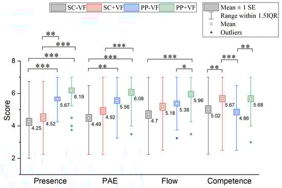 We opted to select specific dimensions from multiple scales to measure subjective experience rather than directly using the Game Experience Questionnaire(GEQ) []. The GEQ is widely used in game experience research, it is designed to cover various types of gaming experiences. In contrast, VR environments are relatively unique, and archery tasks are more akin to physical sports rather than purely electronic games. Therefore, for different dimensions such as presence, we selected the following measurement tools.