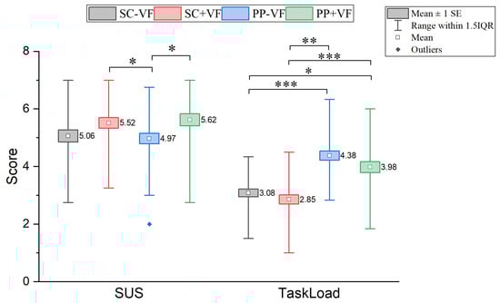 - Task Load: We measured the mental and physical demands of the task using the 6 items of the NASA-TLX questionnaire [], and the overall workload score was computed using the unweighted Raw TLX procedure.