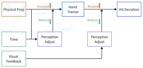 The User experience study shows that, the proposed VR archery interaction framework, which is driven by sensors and physical props, enhanced user’s presence and enjoyment but also affected the task performance. More importantly, by objectively quantifying performance with the proposed sensor-driven VR framework, we reveal the dual-pathway mechanism. Although physics-associated visual feedback doesn’t reduce hand tremor directly, it enables sensorimotor compensation that effectively buffers against motor instability. This compensatory mechanism reveals that visual feedback serves as a crucial moderator in the pathway from physical interface to performance outcomes.