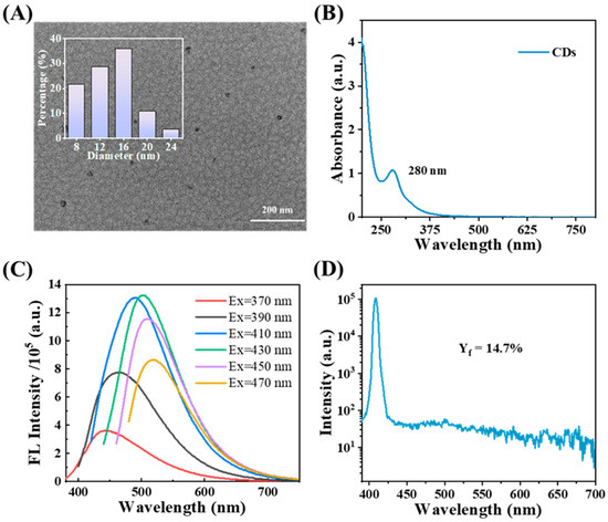 (A) TEM images of CDs; (B) UV–vis absorption spectra of CDs; (C) fluorescence spectra of CDs (excitation wavelength from 370 nm to 470 nm); (D) the FL quantum yield of CDs.